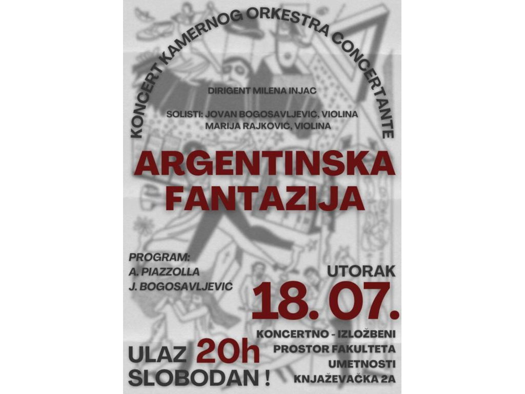 Pod dirigentskom palicom prof. Dr um. Milene Injac, nastupiće Kamerni orkestar “Končertante” Fakulteta umetnosti. Solisti su eminentni violinisti i profesori FU Jovan Bogosavljević i Marija Rajković, a program pod nazivom „Argentinska fantazija“ sadrži dobro poznata i manje poznata dela Astora Pjacole, i svetsku premijeru tango svite Jovana Bogosavljevića, po kojoj je koncert i nazvan.