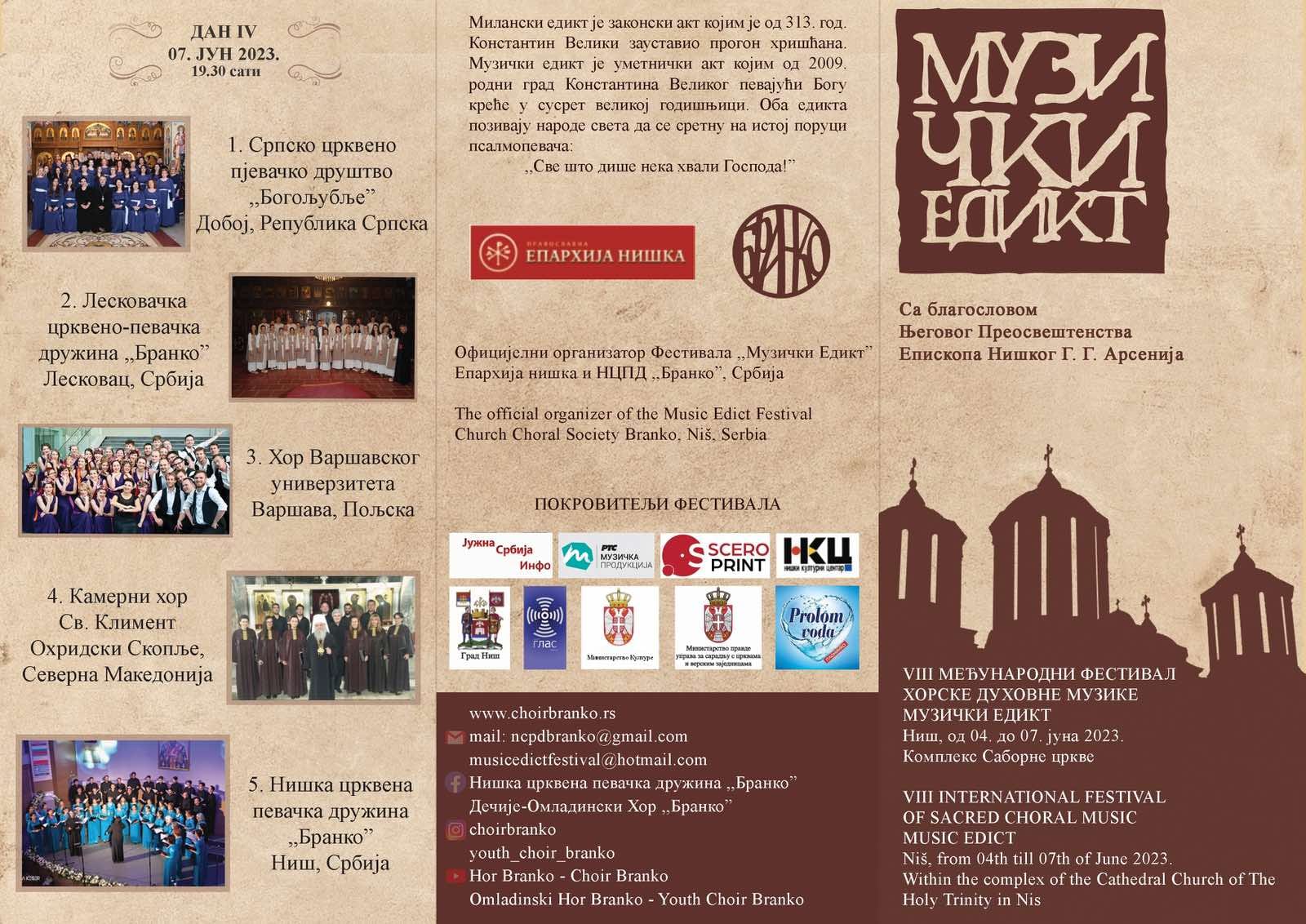 Večeras četvrte, završne večeri međunarodnog festivala horske duhovne muzike "Muzički edikt" u Sabornom hramu sa početkom u 19.30 časova nastupiće.